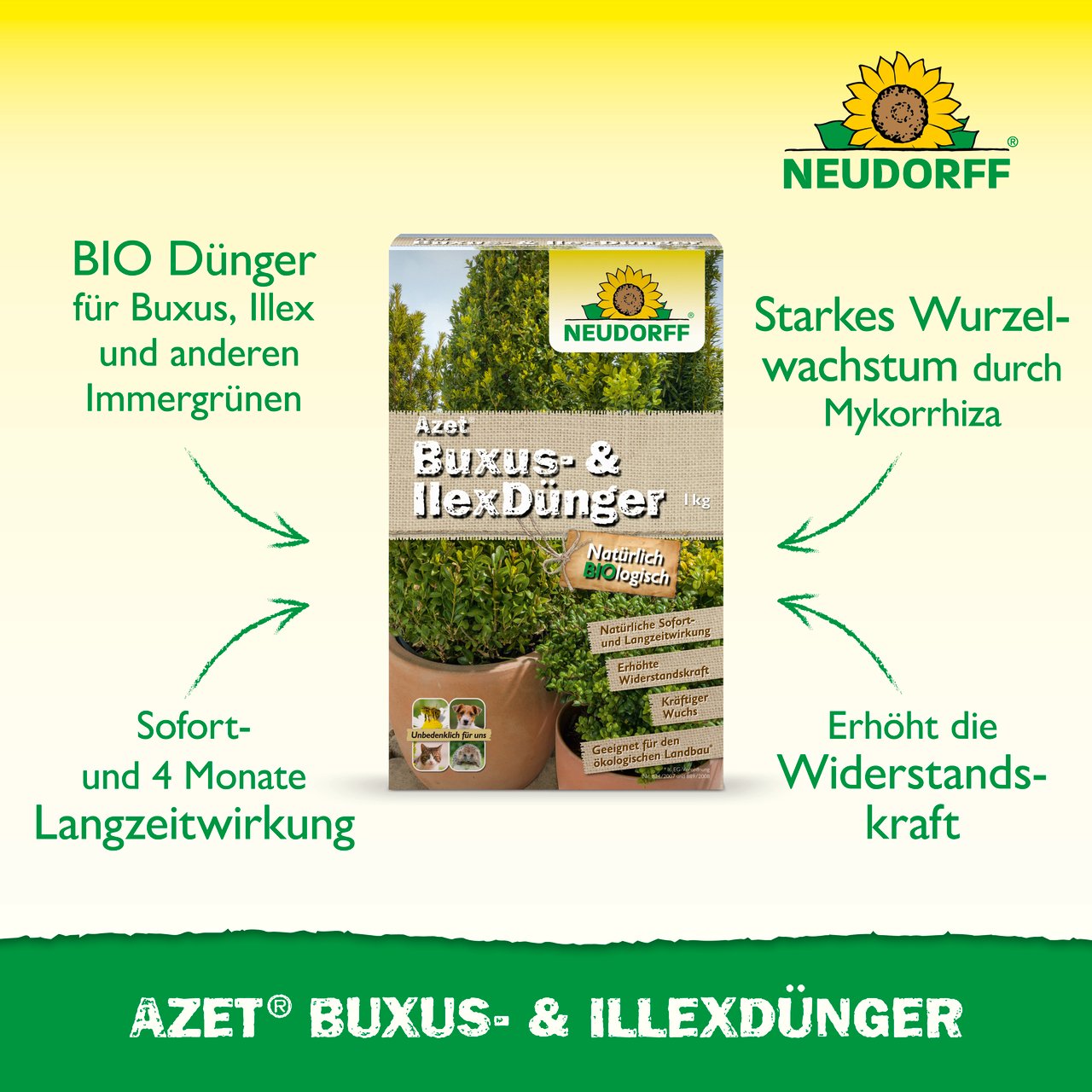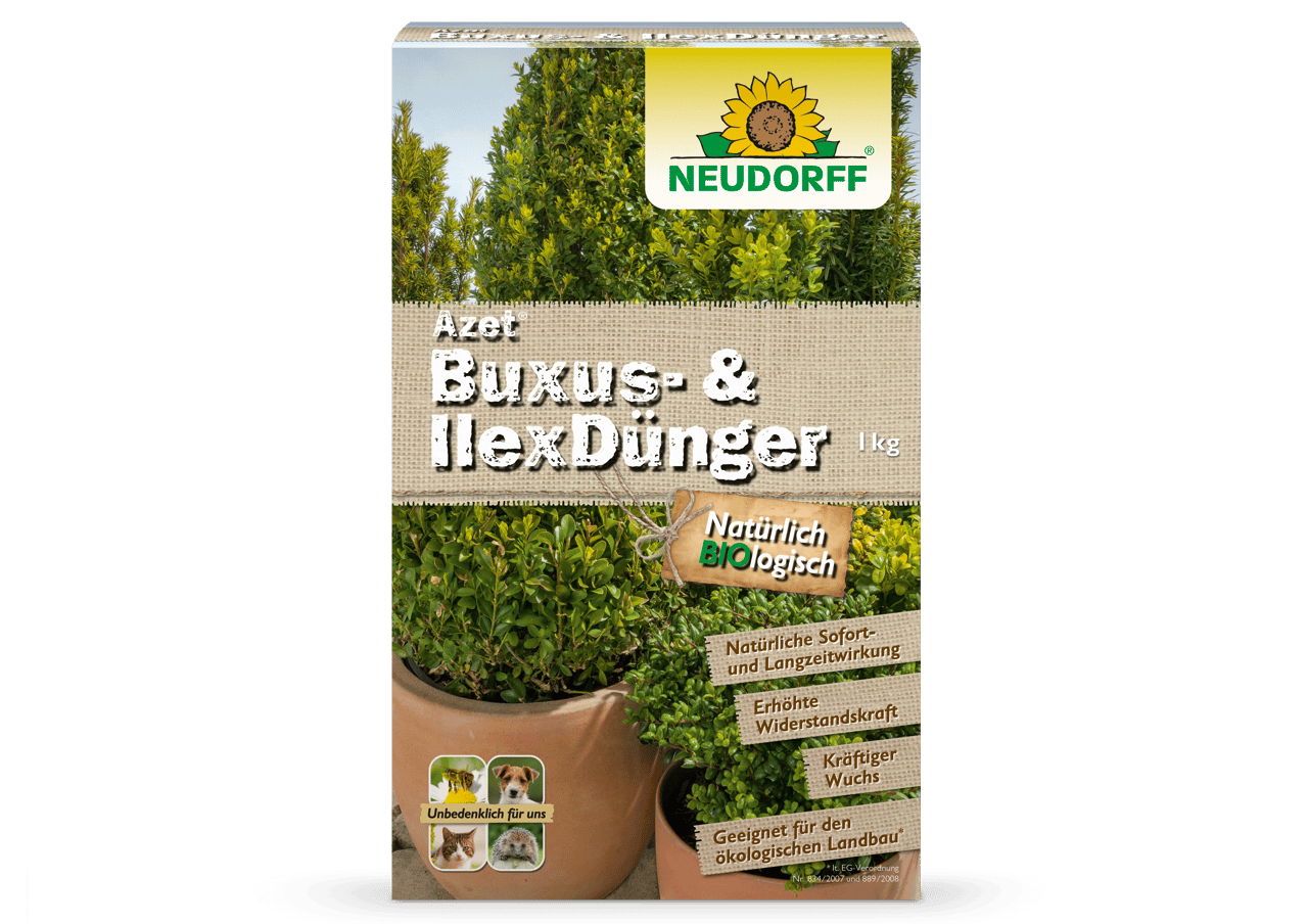 Der organische Azet Buxus- & IlexDünger hat einen NPK-Wert von 7-3-6 und enthält sofort verfügbare Inhaltsstoffe für die schnelle Aufnahme und versorgt Ihre Pflanzen bis zu 100 Tage zuverlässig mit einer ausgewogenen Nährstoffkombination. Azet Buxus- & IlexDünger erhöht die Widerstandfähigkeit gegen Trockenheit, Krankheit und andere Stressfaktoren.