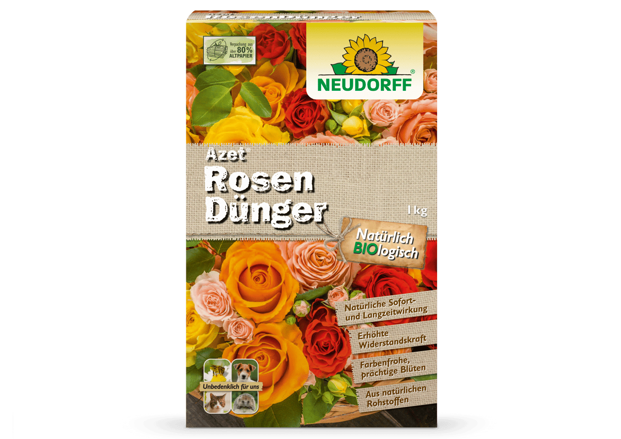 Der organische Azet RosenDünger hat einen NPK-Wert von 7-7-5 und enthält sofort verfügbare Inhaltsstoffe zur schnellen Versorgung der Pflanzen und bietet gleichzeitig bis zu 100 Tagen eine zuverlässige Langzeitwirkung. Azet RosenDünger fördert eine üppige Blütenpracht und einen kräftigen Wuchs. Er erhöht die Widerstandsfähigkeit gegen Trockenheit, Krankheit und andere Stressfaktoren.