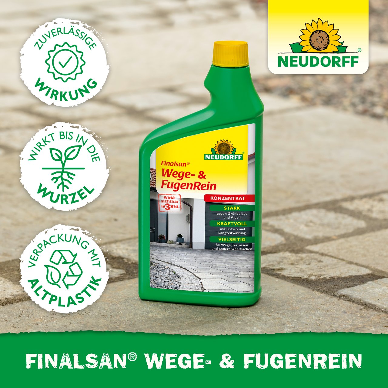 Vor der Behandlung die angrenzenden Flächen mit einer undurchlässigen Abdeckung (z. B. Plastikfolie, 0,5 m breit) abdecken. Entfernen und entsorgen Sie die undurchlässige Abdeckung nach der Behandlung. Nicht über oder in der Nähe von Oberflächengewässern anwenden. Nicht bei Regenwetter oder auf gefrorenen Flächen behandeln. Finalsan Wege- & FugenRein einmalig anwenden. Wenn ein erneuter Befall festgestellt wird, kann die Anwendung wiederholt werden, aber nicht mehr als zweimal pro Jahr anwenden. Sollte die Behandlung unwirksam sein, ist der Zulassungsinhaber zu informieren. Der Geruch von Finalsan Wege- & FugenRein ist wirkstoffspezifisch und bereits nach kurzer Zeit nicht mehr wahrnehmbar.