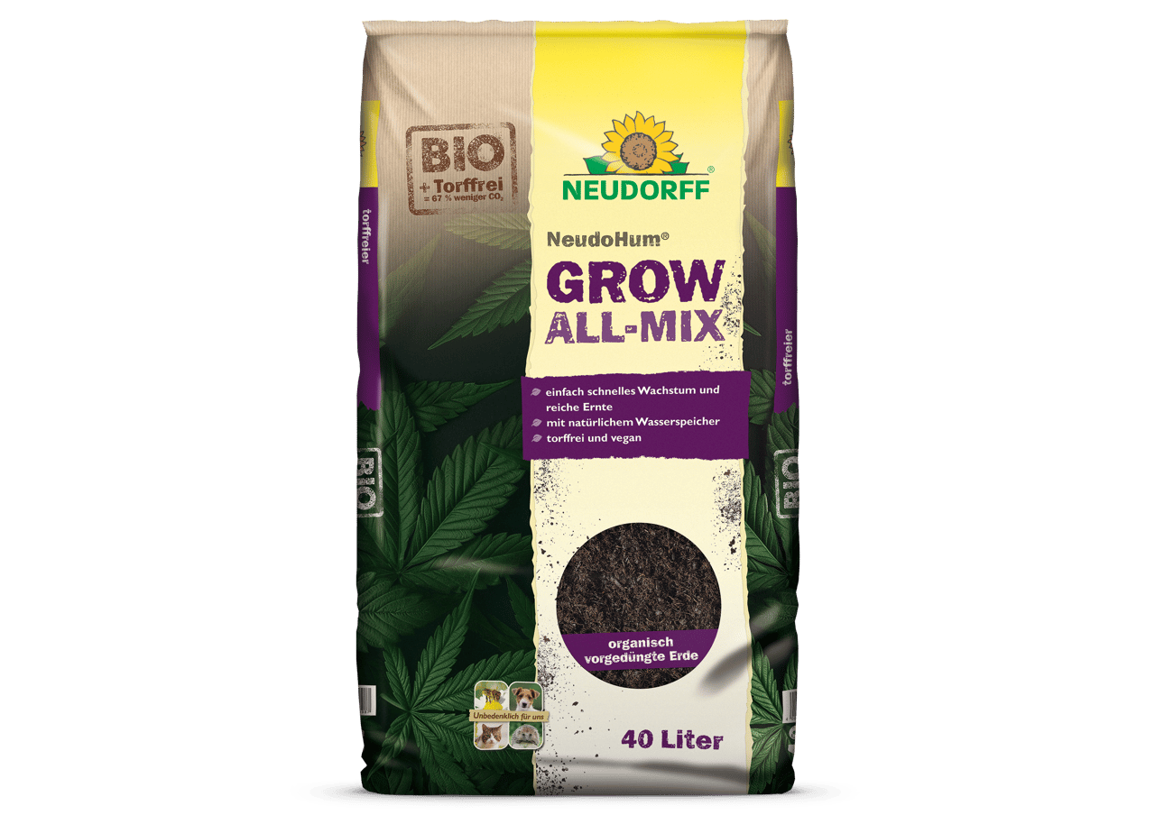 Die NeudoHum Grow All-Mix Erde - speziell für den Cannabis-Anbau entwickelt. Diese Bio-Erde fördert nicht nur ein schnelles Wachstum, sondern sichert auch eine ertragreiche und qualitativ hochwertige Ernte. Der Grow All-Mix ist für alle Wachstumsphasen von der Aussaat über die Blüte bis hin zur Ernte optimal geeignet. Dank ihrer speziellen Zusammensetzung speichert die Erde effektiv Wasser und gibt es gleichmäßig an die Pflanzen ab, ohne Staunässe zu verursachen. Als 100% vegane und organische Erde ist sie mit rein pflanzlichem Dünger für die ersten 4 Wochen vorgedüngt und unbedenklich für Mensch und Tier.