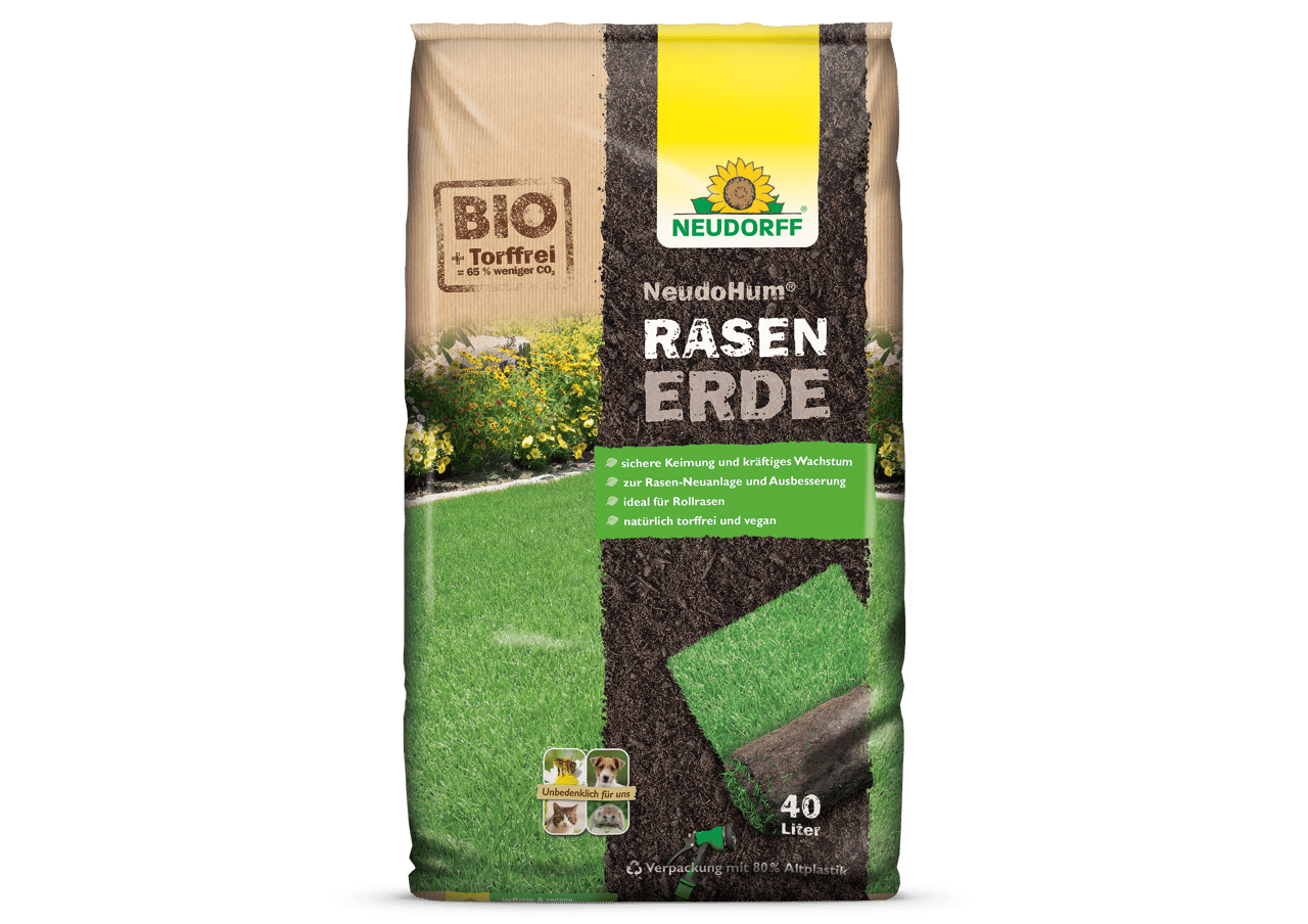 NeudoHum RasenErde bietet das, was die Rasengräser brauchen! Die hochwertige Spezialerde sorgt für dichten und sattgrünen Rasen. Verwenden Sie das torffreie Erdensubstrat für Neuanlagen, Nachsaat und Ausbesserung von Rasenflächen. NeudoHum RasenErde unterstützt Rasensamen beim Keimen und schafft ideale Anwachsbedingungen auch für Rollrasen. Angereichert mit Bio-Pflanzenkohle und organischem Dünger verbessert NeudoHum RasenErde den Boden nachhaltig. Der Boden wird lockerer, so dass die Wurzeln mehr Sauerstoff bekommen und besser wachsen. Die Erde sorgt außerdem für eine optimale Wasser- und Nährstoffspeicherung. Sie ist speziell abgestimmt auf die Bedürfnisse von Rasengräsern.