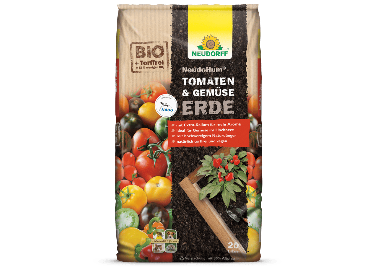 NeudoHum Tomaten- & GemüseErde bietet das, was die Pflanze braucht. Sie ist das optimale Pflanzsubstrat mit einem hohen Gehalt an natürlichem Kalium für aromatische Tomaten, Zucchini, Paprika, Kürbis, Gurken und andere Gemüsearten. NeudoHum Tomaten- & GemüseErde ist besonders für Hochbeete und Kübel geeignet und bietet den Pflanzen eine gute Standfestigkeit. Die Faserstruktur sorgt für eine höhere Wasser- und Nährstoffspeicherfähigkeit, Blähton für eine hohe Strukturstabilität. Schutz vor Trauermücken und Pilzbefall bietet die schnell abtrocknende Oberfläche. Der zugefügte organische Naturdünger garantiert eine pflanzengerechte Nährstoffversorgung für etwa 3-4 Wochen.
