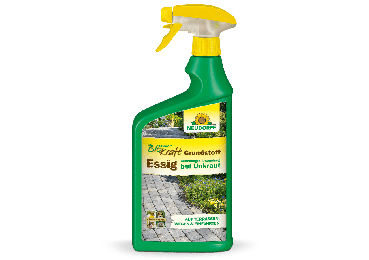 Neudorffs BioKraft Grundstoff Essig ist genehmigt zur Anwendung gegen Unkräuter auf Wegen, Bordsteinen, Gehwegen und Terrassen. Zusätzliche genehmigt ist es zur Desinfektion an Garten-Schneidewerkzeugen. Unkräuter sind ein großes Thema, gerade auf befestigten Flächen gab es bislang wenig gute Lösungen. Es ist zu 100 % natürlich und besteht aus nachwachsenden Rohstoffen in Lebensmittelqualität.