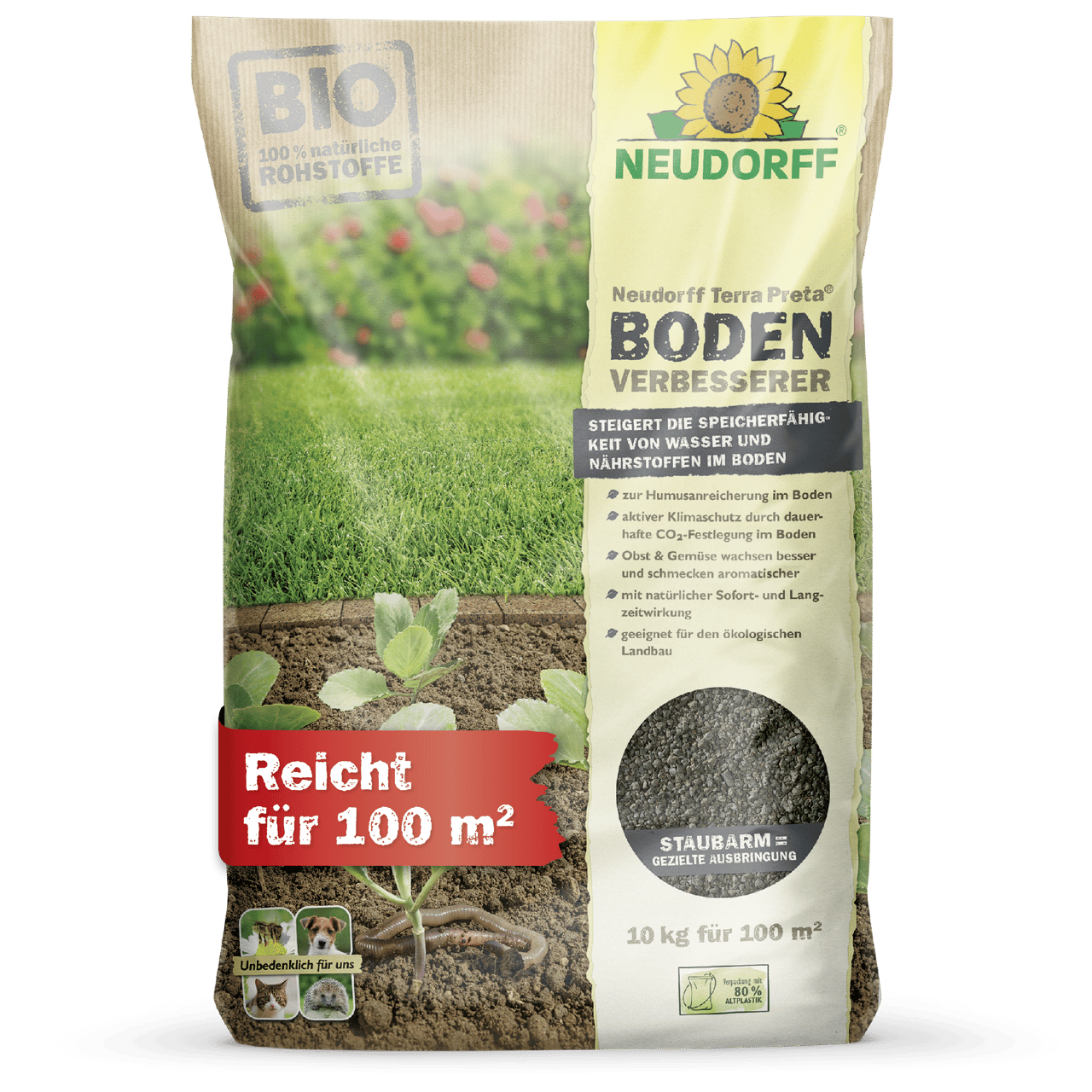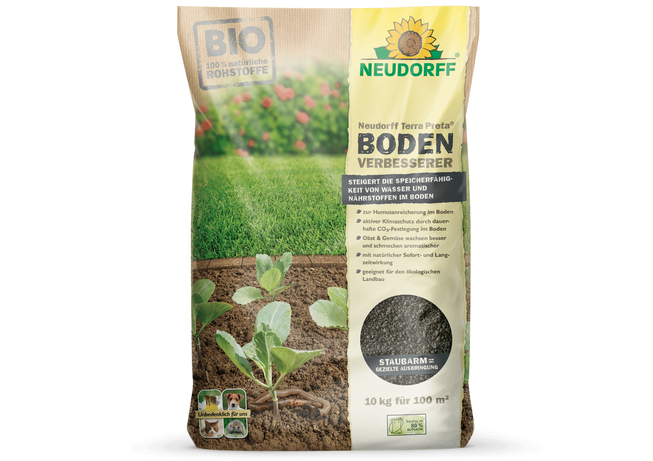 Der Neudorff Terra Preta BodenVerbesserer ist ein organisch-mineralischer NPK- Dünger, der für alle Böden und Kulturen geeignet ist. Die Inhaltsstoffe Bio-Pflanzenkohle, organisches Material und Mikroorganismen sorgen für einen aktiven Humusaufbau, der den Boden nachhaltig verbessert. Das staubarme Granulat ermöglicht zielgerechte Ausbringung mit dem Streuwagen oder per Hand. Unbedenklich für Haustiere, Nützlinge und Menschen. Ressourcenschonend in Deutschland produziert.