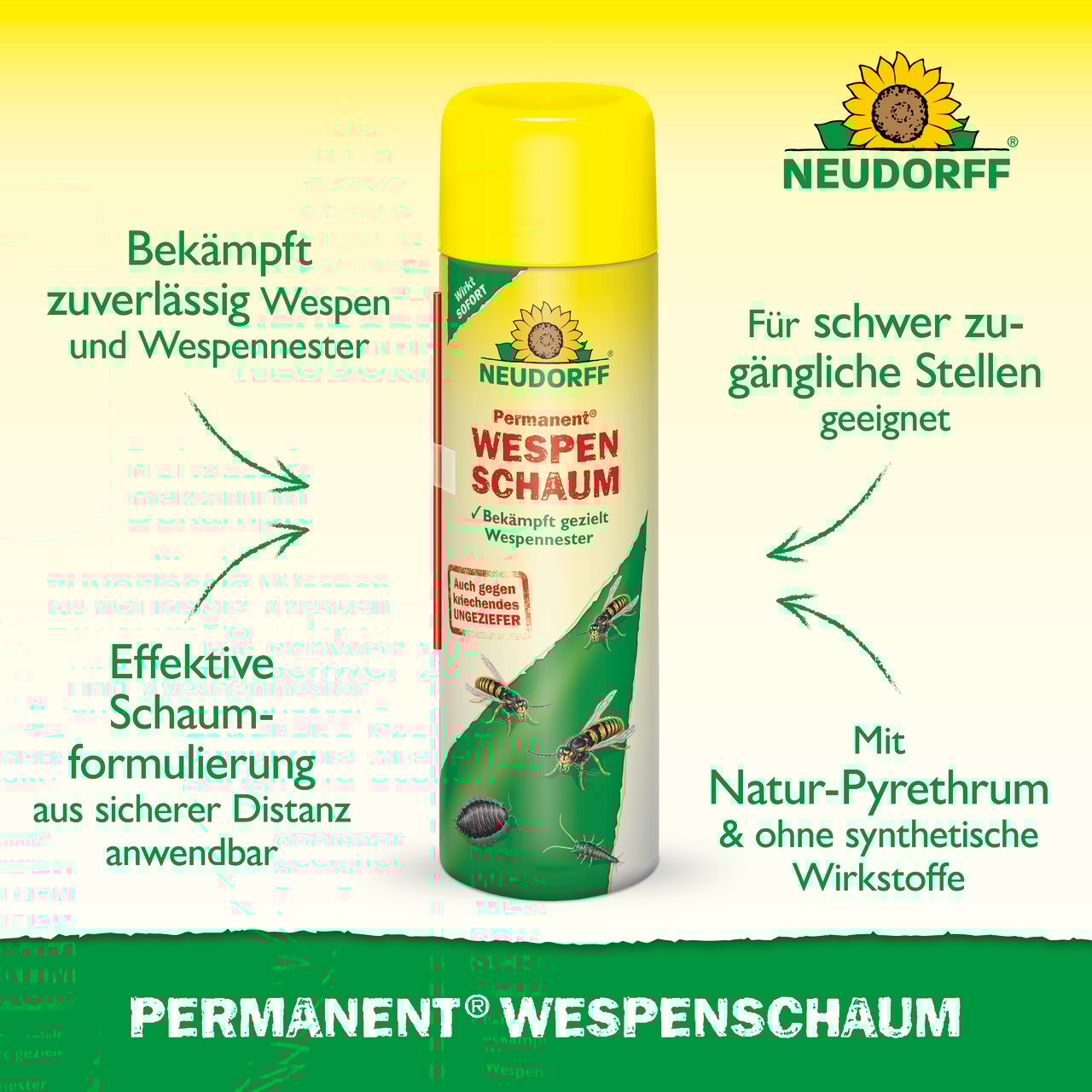 Schnell und zuverlässig. Dies beruht auf dem enthaltenen Wirkstoff Pyrethrum, der aus Chrysanthemenblüten gewonnen wird. Der Schaum dringt in Nester, Hohlräume und Gänge ein. Wespen bzw. kriechendes Ungeziefer sterben kurze Zeit nach Kontakt mit dem Schaum. Er verhindert ebenfalls, dass Wespen aus dem Nest herausfliegen und den Anwender angreifen.