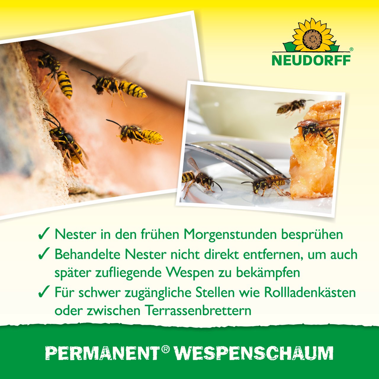 Entfernen Sie das behandelte Nest nicht sofort. So bekämpfen Sie auch später zufliegende Wespen.