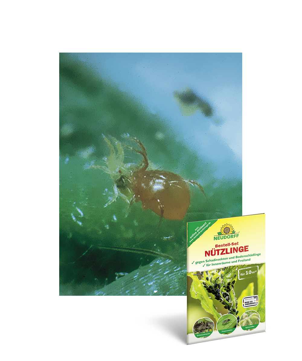 Phytoseiulus persimilis PP-RAUBMILBEN GEGEN SPINNMILBEN Freilassungen im Juni sehr gut bewährt. In dieser Zeit ist stets mit Spinnmilbenbefall zu rechnen. Entfernen Sie keine Blätter während des Einsatzes von PP-Raubmilben. Sie entfernen dabei die Nützlinge.