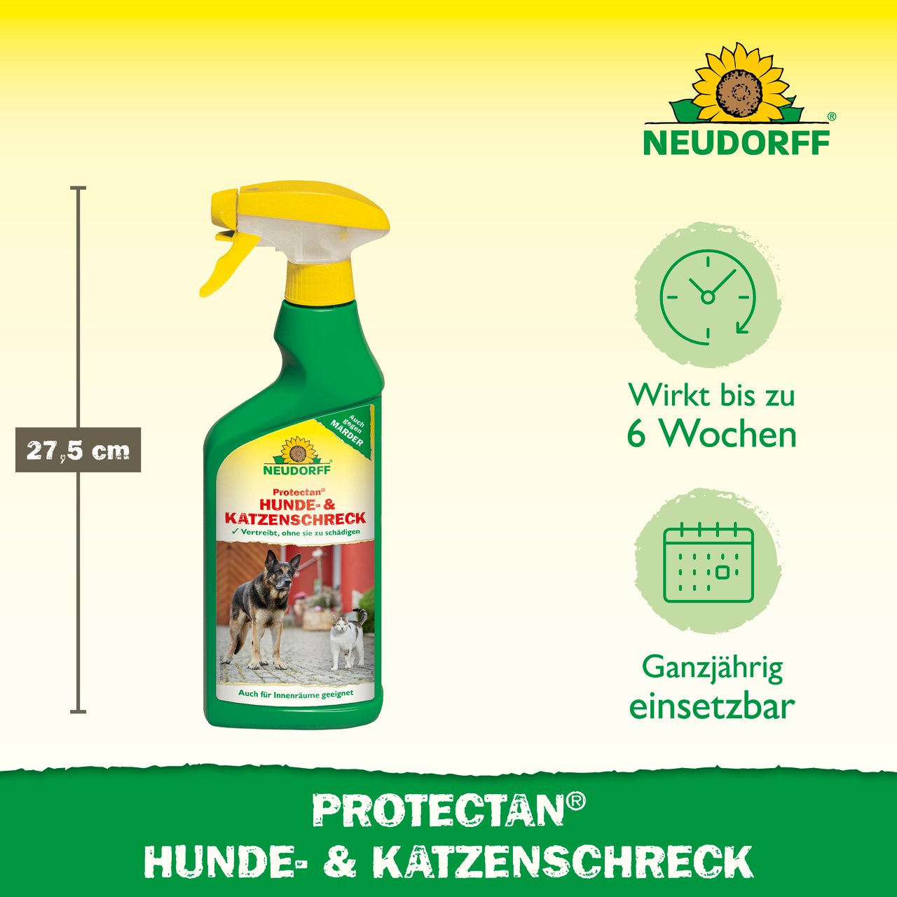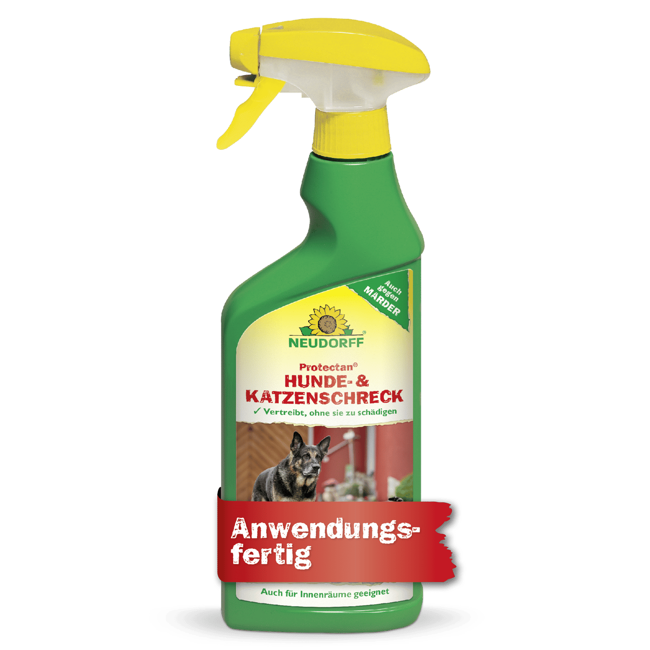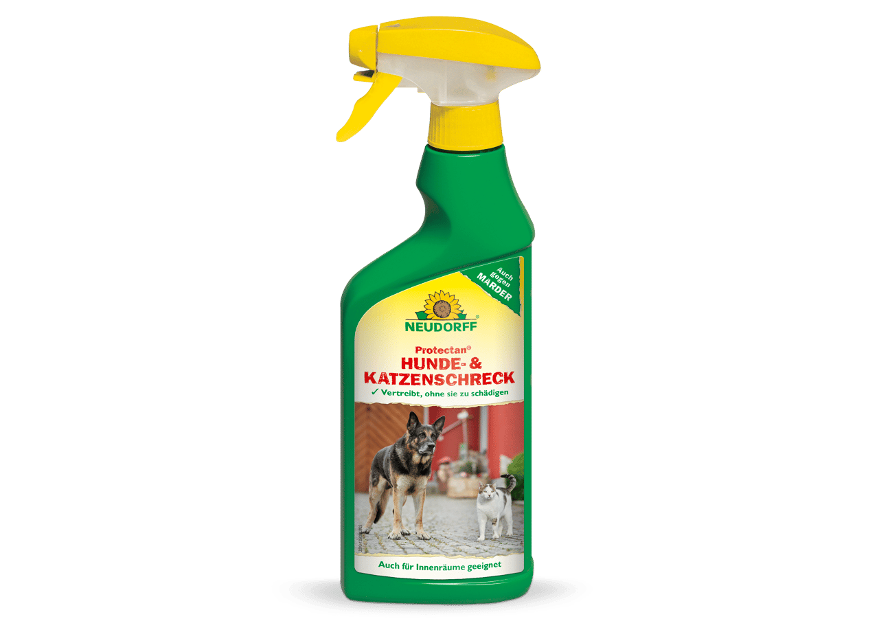 Protectan Hunde- und KatzenSchreck ist ein anwendungsfertiges Fernhaltemittel gegen Hunde und Katzen im Innen- und Außenbereich. Es vertreibt Hunde und Katzen, ohne sie zu schädigen, wirkungsvoll von Mauern, Zäunen, Wegen und Plätzen. Das mit Protectan Hunde- und Katzen-Schreck behandelte Territorium meiden die Tiere dann. Wirkt auch gegen Marder auf Dachböden und im Außenbereich. Das Produkt enthält einen Wirkstoff, der aus den Blättern des Zitroneneukalyptusbaums gewonnen wird und auf Wirbeltiere einen stark abschreckenden Geruch ausübt. Behandelte Flächen bzw. Gegenstände können nach dem Antrocknen des Mittels sofort wieder vom Menschen genutzt werden. Bei empfindlichen Materialien bitte vor der Anwendung einen Verträglichkeitstest an verdeckter Stelle durchführen. Eine Anwendung im und am Auto wird nicht empfohlen. Nicht auf Pflanzen sprühen.