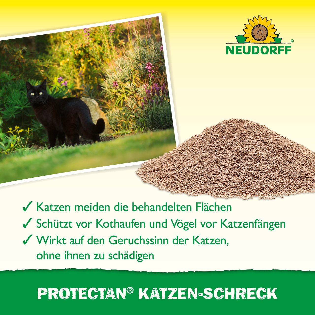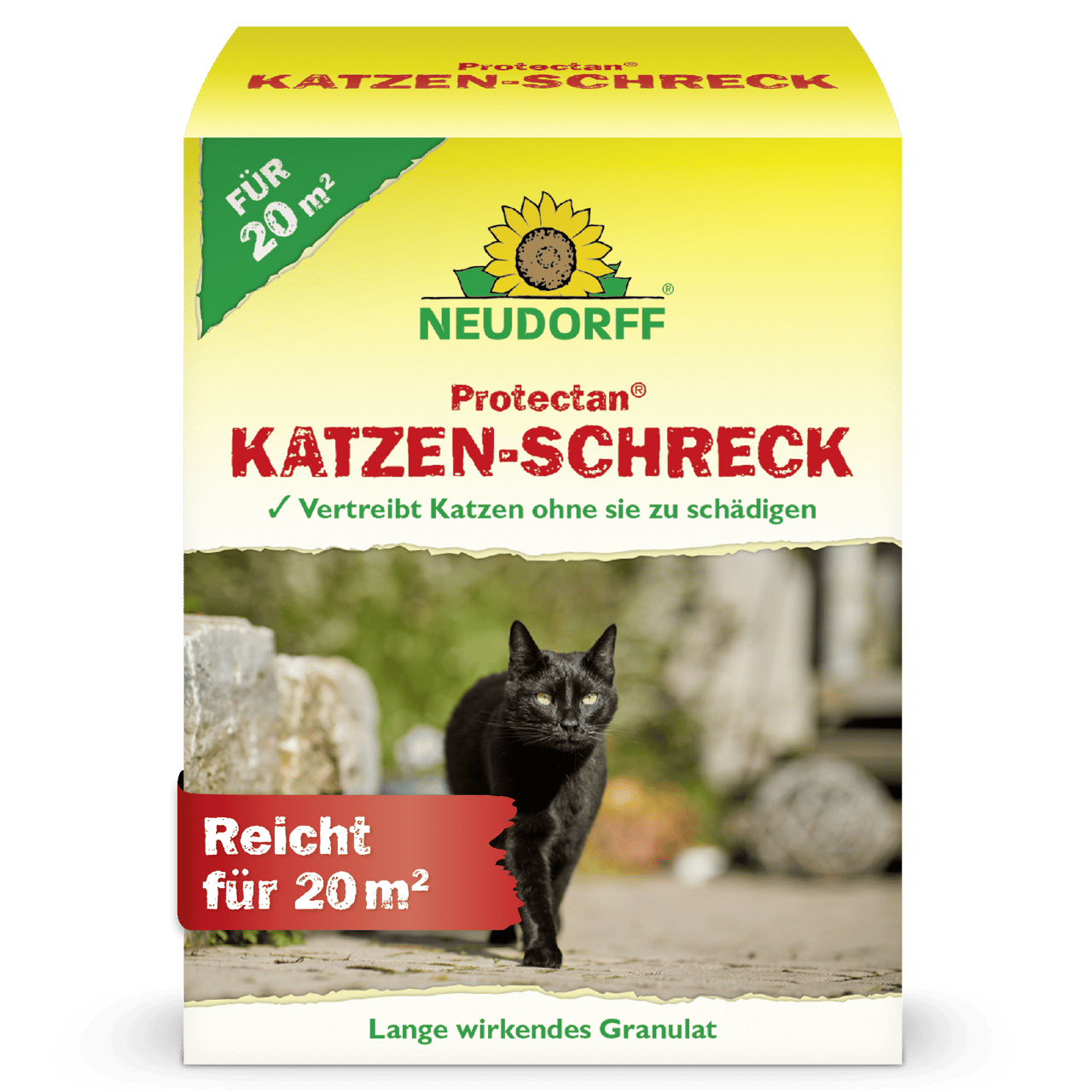 Protectan Katzen-Schreck ist ein Fernhaltemittel in Granulatform gegen Katzen. Tiere meiden einfach das zu schützende Territorium. Der langanhaltende Geruch von Protectan Katzen-Schreck vertreibt Katzen wirkungsvoll aus Hinterhöfen, von Terrassen sowie Plätzen, an denen sich regelmäßig Vögel aufhalten. Katzen-Schreck wirkt auf Basis von Mineralien und Duftstoffen, wie sie auch in der Natur vorkommen. Die Schutzdauer beträgt je nach Witterung 3–4 Wochen. Aufgrund des intensiven Geruchs des Mittels empfehlen wir, Katzen-Schreck ausschließlich im Außenbereich anzuwenden. Hinweis: Die Wirkung von Protectan Katzen-Schreck tritt oft erst verzögert nach einigen Tagen ein. Es kann sein, dass die Katzen nach der Ausbringung die behandelten Flächen zunächst besonders stark belaufen. Dies ist auf ein arttypisches Verhalten der Katzen zurückzuführen, da Katzen, die zur Markierung ihres Revieres Duftmarken gesetzt haben, Fremdgerüche dort nicht akzeptieren wollen. Aufgrund der langanhaltenden Geruchswirkung von Protectan Katzen-Schreck geben die Katzen ihr ursprüngliches Revier mit der Zeit auf und meiden schließlich die behandelten Flächen.