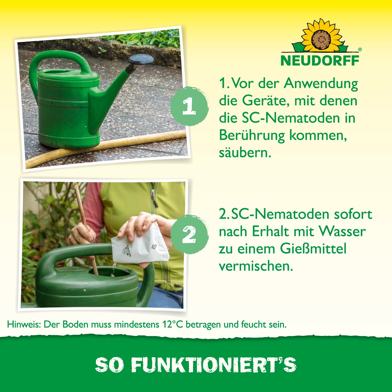 SC-Nematoden von Neudorff bekämpfen gezielt die Larven von Wiesenschnaken, Maulwurfsgrillen und Erdraupen im Boden. Die Nützlinge wirken 100 % biologisch, sind unbedenklich für Mensch, Tier und Umwelt und eignen sich bestens für den ökologischen Landbau.