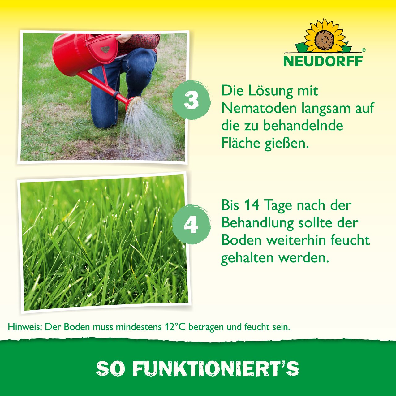 Nach der Bestellung werden die Nematoden frisch geliefert und sollten möglichst sofort ausgebracht werden. Dazu wird der Beutelinhalt in Wasser eingerührt und die Lösung gleichmäßig auf die betroffenen Flächen gegossen. Besonders wirksam sind die Nützlinge bei feuchtem Boden, der in den folgenden 14 Tagen regelmäßig gewässert werden sollte. So bleiben die Nematoden bis zu sechs Wochen aktiv und sorgen für eine deutliche Reduzierung des Schädlingsdrucks.