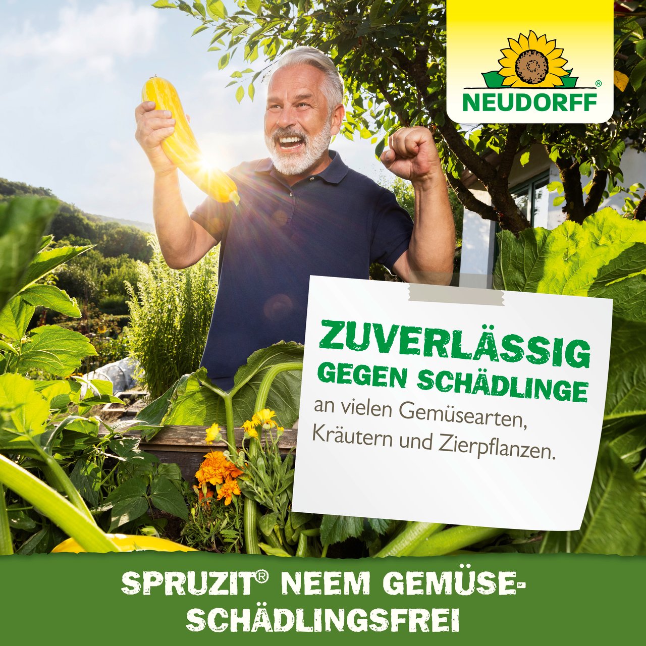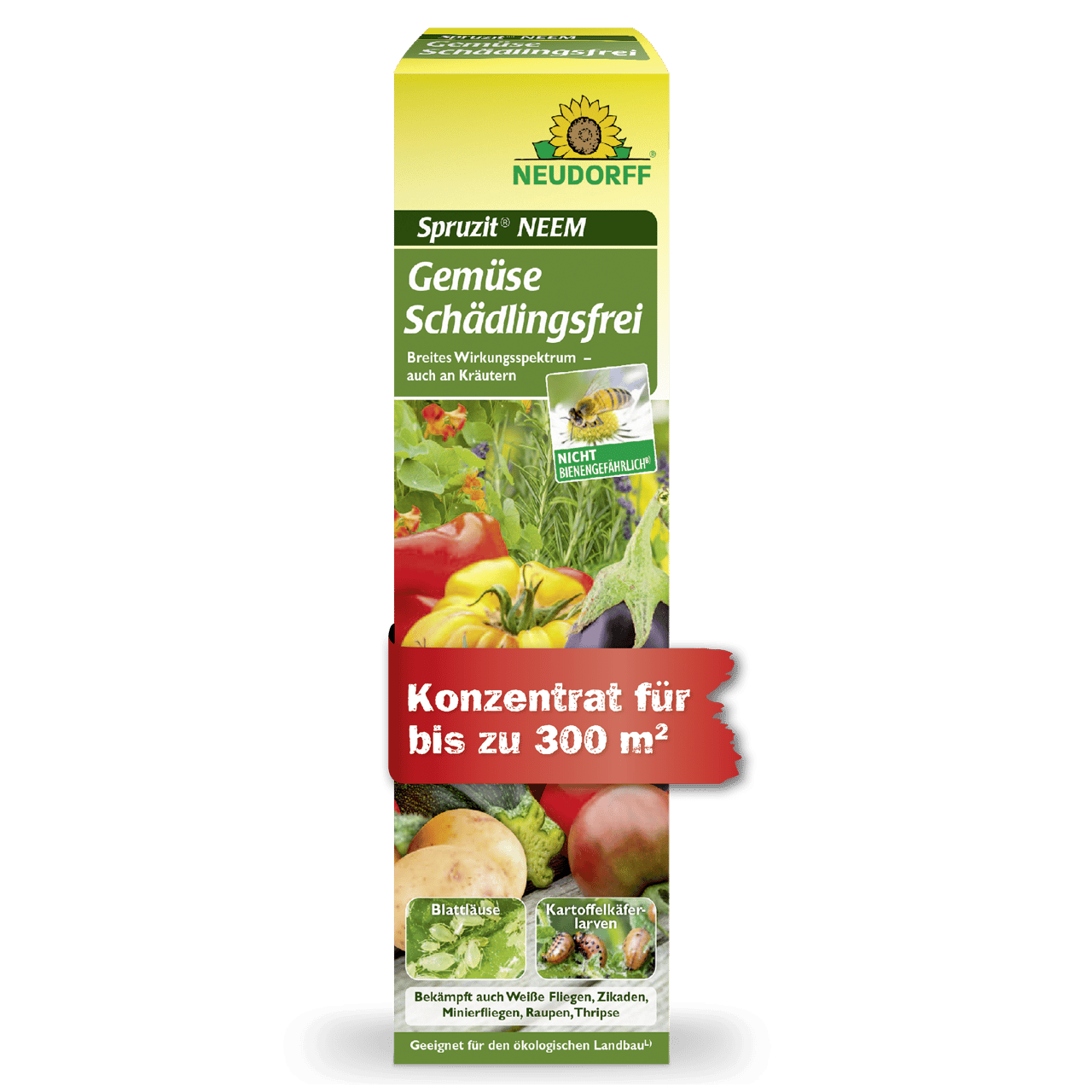 Spruzit® NEEM GemüseSchädlingsfrei wird in Wasser verdünnt. Verdünnung siehe Tabelle Aufwandmenge. Wirkt optimal,wenn die Pflanzen gründlich - auch die Blattunterseiten - gespritzt werden. Keine Anwendung bei direkter Sonneneinstrahlung und bei hohen Temperaturen, bevorzugt frühmorgens oder in den Abendstunden spritzen. Nie mehr Spritzbrühe ansetzen als gebraucht wird. Anwendungszeitpunkt: Bei Befallsbeginn bzw. bei Sichtbarwerden der ersten Symptome/Schadorganismen. Spritzen bis zur sichtbaren Benetzung. Bei der Anwendung gegen Trauermücken: Gießanwendung Wartezeit: Tomate, Zucchini, Gurke, Kürbis, Aubergine, Gemüsepaprika, Kopfkohle - 3 Tage, Kartoffeln - 4 Tage, Spinat und verwandten Arten - 7 Tage, Frische Kräuter - 14 Tage
