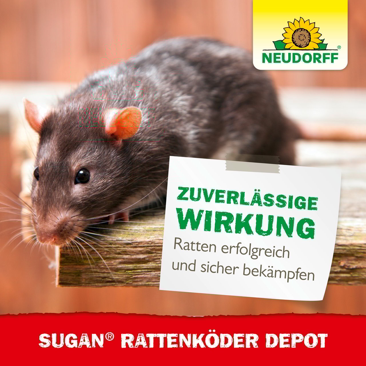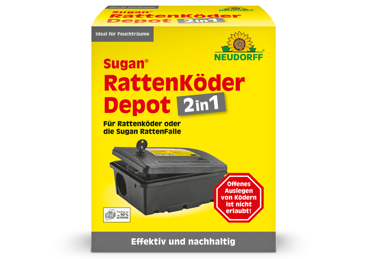 Gebe den Rattenköder gemäß der Anweisung auf der Verpackung in die „Futterkammer“. Ringförmige oder pastenförmige Rattenköder in Papiertütchen können Sie auf dem Metallspieß aufreihen, der in der Halterung über der Köderschale liegt. Damit wird das Verschleppen der Köder durch die Ratten verhindert. Verschließe das Depot durch Herunterdrücken des Deckels. Das Köderdepot sollte so aufgestellt werden, dass es für Kinder, Haus- und Wildtiere unerreichbar ist. Achte darauf, dass die Schlupflöcher parallel zur Wand ausgerichtet sind. Mit der beigefügten Kunststoff-Wandhalterung kannst du das Sugan® Ratten-Köder Depot befestigen, so dass das Depot nicht weggeschoben werden kann. Schraube dafür die Halterung in der passenden Höhe fest (Schraubösen nach oben). Schiebe dann das Sugan® RattenKöder Depot mit den senkrechten Stegen an der Rückseite von oben in die passenden Schlitze der Wandhalterung.